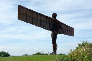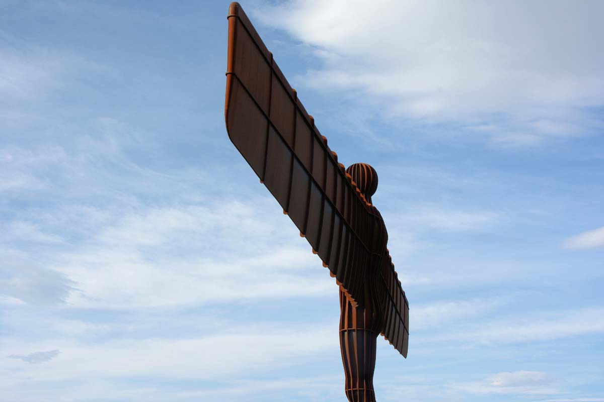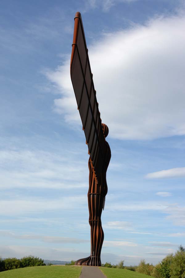 The Angel of the North is a contemporary sculpture, designed by Antony Gormley, located in Gateshead, Tyne and Wear, England. Completed in 1998, it is a steel sculpture of an angel, 20 metres (66 ft) tall, with wings measuring 54 metres (177 ft) across. The wings do not stand straight sideways, but are angled 3.5 degrees forward to create "a sense of embrace". It stands on the hill of Birtley, at Low Eighton in Lamesley, overlooking the A1.