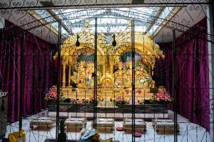 The estate of Bhaktivedanta Manor is situated in the Parish of Aldenham in Hertfordshire, just over a mile from Radlett and four miles from Watford. The presence of the estate was first recorded in 1261. In the 16th Century a Tudor house was built on the site but in 1884 George Villies demolished the house and constructed the mock-Tudor building we see today. It was sold, included 17 acres of land to George Harrison of the Beatles who gave it as a gift to the International Society for Krishna Consciousness (ISKCON), better known as the Hare Krishna movement. It now stands in 70 acres of landscaped grounds and is ISKCON's largest property in the United Kingdom, and one of the most frequently visited Radha Krishna temples in Europe. The house is listed Grade II on the National Heritage List for England.